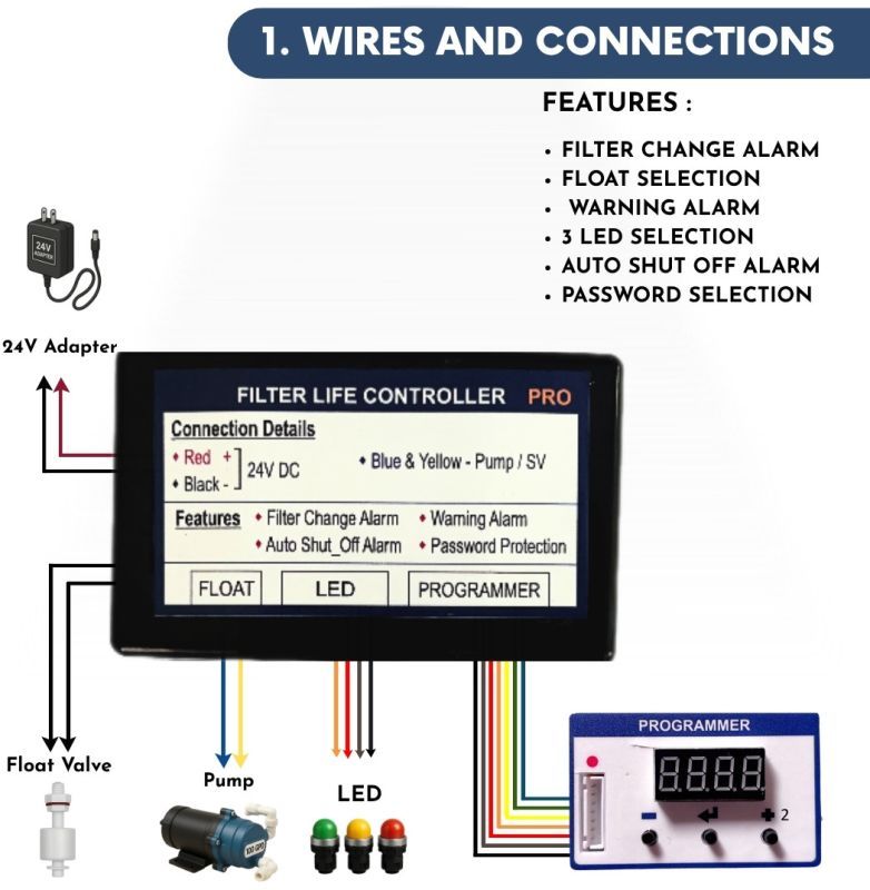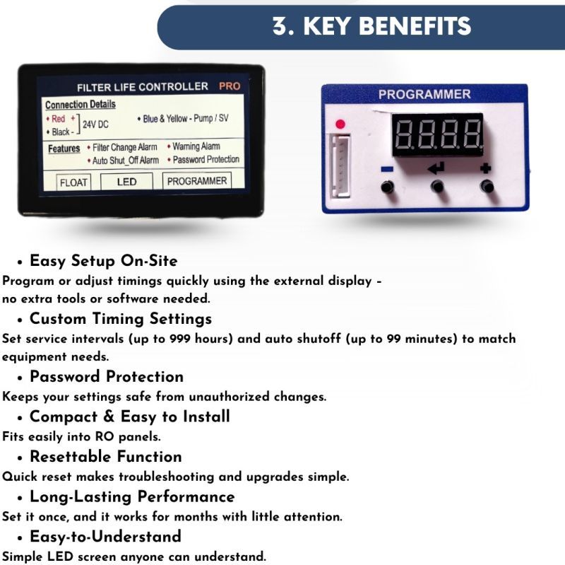 This compact and budget-friendly RO Timer Controller is specially designed for water purifiers to help customers and technicians manage filter service schedules, prevent pump overruns, and ensure smooth operation.