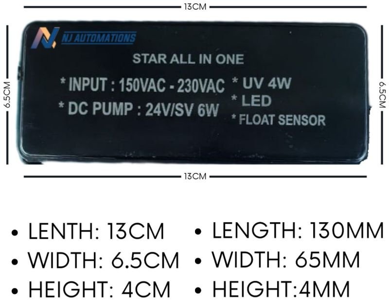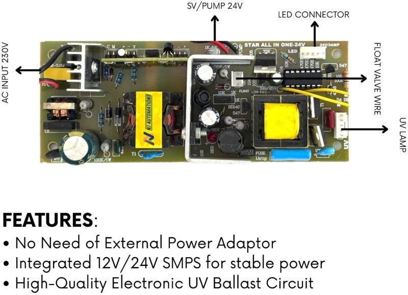 | Feature | No Need Of External Power Adaptor,Integrated 12V/24V SMPS For Stable Power,High-Quality Electronic UV Ballast Circuit,UV Lamp Failure Detection Alarm,Additional Power Protection Circuit,Automated Shutdown: 90 Minutes,End-of-Life Filter Replacement Indicat |