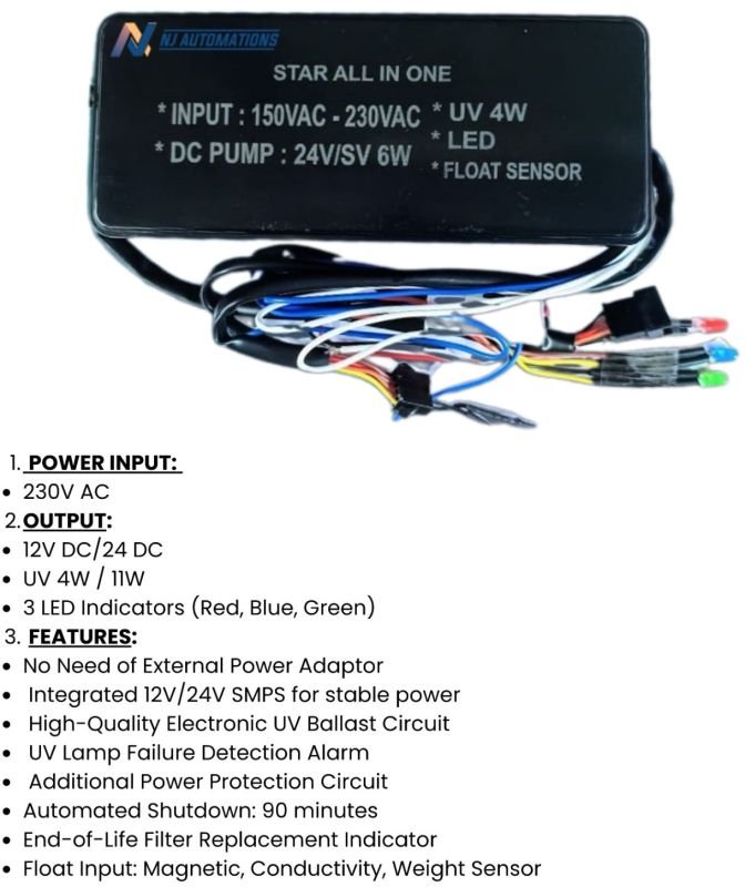 Application: Specifically designed for UV water purifiers, ensuring reliable and efficient purification with built-in safety features like UV fail alarm and process indication.